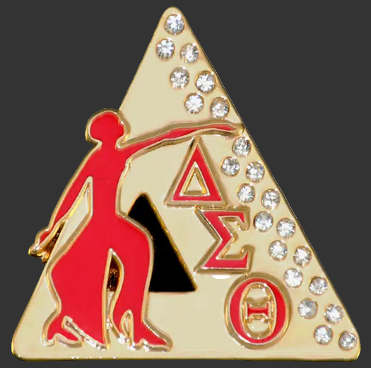Delta Sigma Theta Pyramid Lapel Pin. Measuring 1.15" in both height and width, this compact yet striking accessory combines warm gold toning with sparkling crystals and vibrant red enamel detailing. The revered Lady of Fortitude takes center stage, framed by the Greek letters that instantly identify your sororal bond. Whether pinned to your professional wardrobe, ceremonial attire, or everyday wear, this piece commands attention while honoring your commitment to excellence, sisterhood, and service.