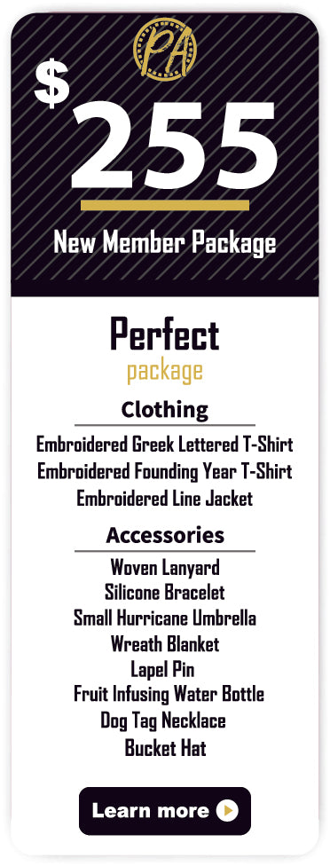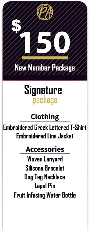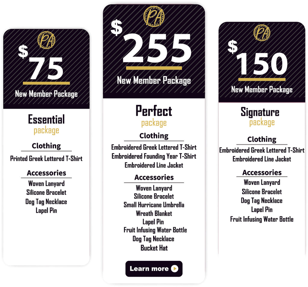 New member packages for members of Alpha Phi Alpha Fraternity, Incorporated.  There are three package levels to select from the Essential, Signature, and Perfect packages.  We combined the most popular items that new members purchase and created a cost-saving package.