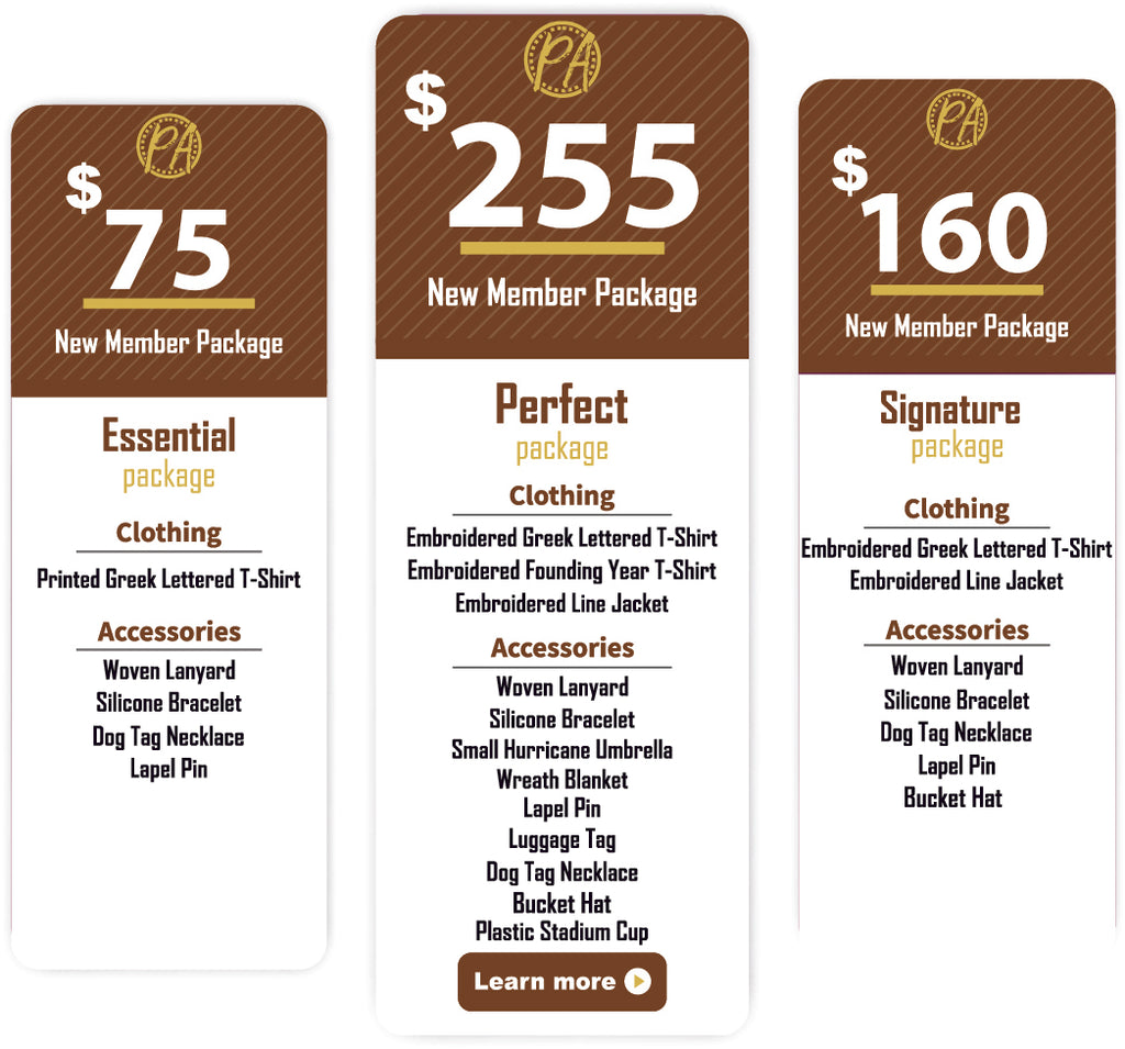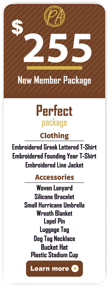 New member packages for members of Iota Phi Theta Fraternity, Incorporated. There are three package levels to select from the Essential, Signature, and Perfect packages. We combined the most popular items that new members purchase and created a cost-saving package.