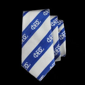 The design features bold diagonal blue and white stripes, with the Greek letters ΦΒΣ (Phi Beta Sigma) elegantly repeated along the length of the tie. Whether you're attending a fraternity event, a professional gathering, or simply want to represent Phi Beta Sigma in style, this tie serves as the perfect accessory.