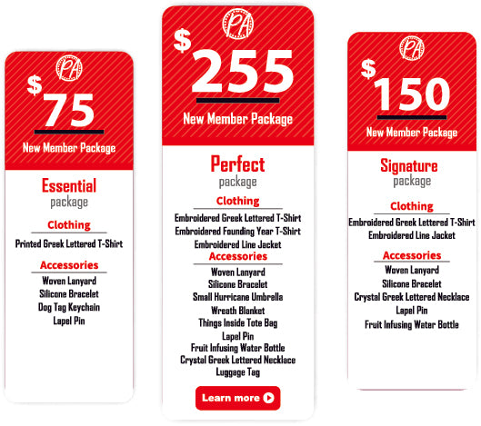 New member packages for members of Delta Sigma Theta Sorority, Incorporated. There are three package levels to select from the Essential, Signature, and Perfect packages. We combined the most popular items that new members purchase and created a cost-saving package.